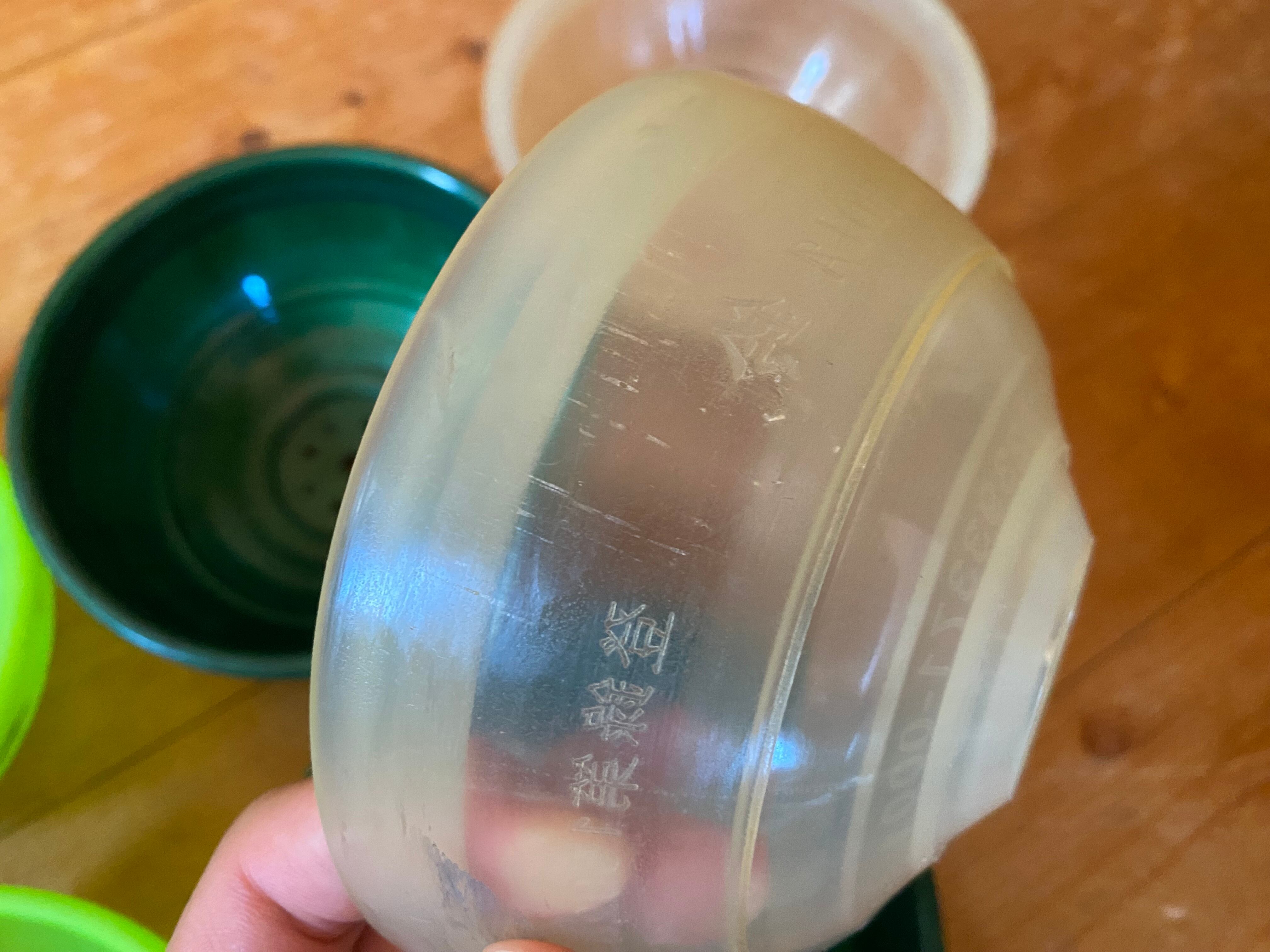 傷や汚れ、カップのすり減りがあります。カップ内側の印字を紙やすりで削り取ってあるものもあります。クリアは黄ばみが目立ちます。